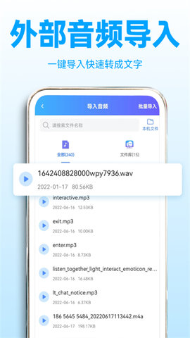 如需转换手机中已有的录音文件,请返回主界面选择文件转写功能。点击导入按钮,从您的设备存储中选择MP3、WAV、M4A等格式的音频文件。软件上传并分析文件后,会自动开始转写过程,转写进度会清晰显示。完成后,完整的文本会呈现在编辑器中供您查阅。