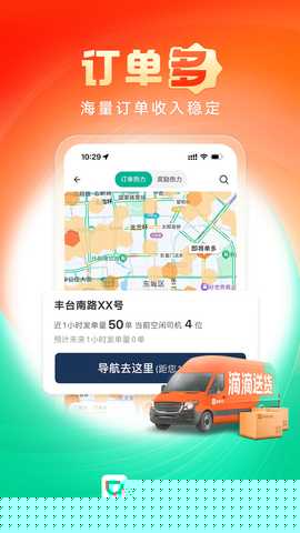 2. **海量订单,随时接单**:滴滴送货司机为司机提供了来自千万级用户的海量订单,司机只需点击开始听单按钮,即可轻松获取订单,快速响应客户需求,提高工作效率。