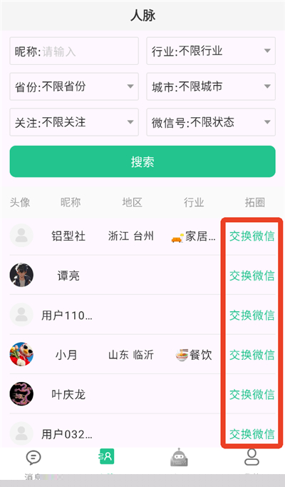 内置基于多维条件筛选的人脉搜索系统,可直接在应用内完成潜在客户的发现、关注与即时通讯,打通从寻客到沟通的闭环。