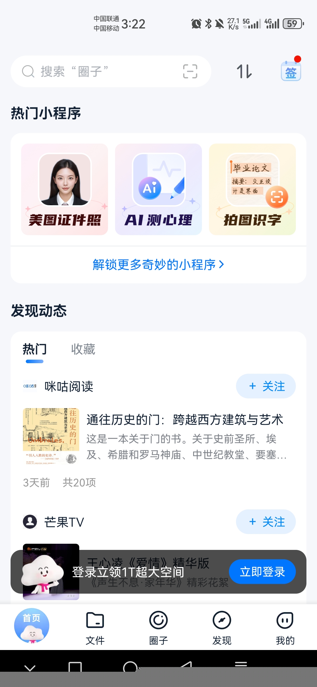 1.首先请在本网站本页面下载安装最新版本的中国移动云盘app,打开软件进入首页,第一种方式是点击立即登录。