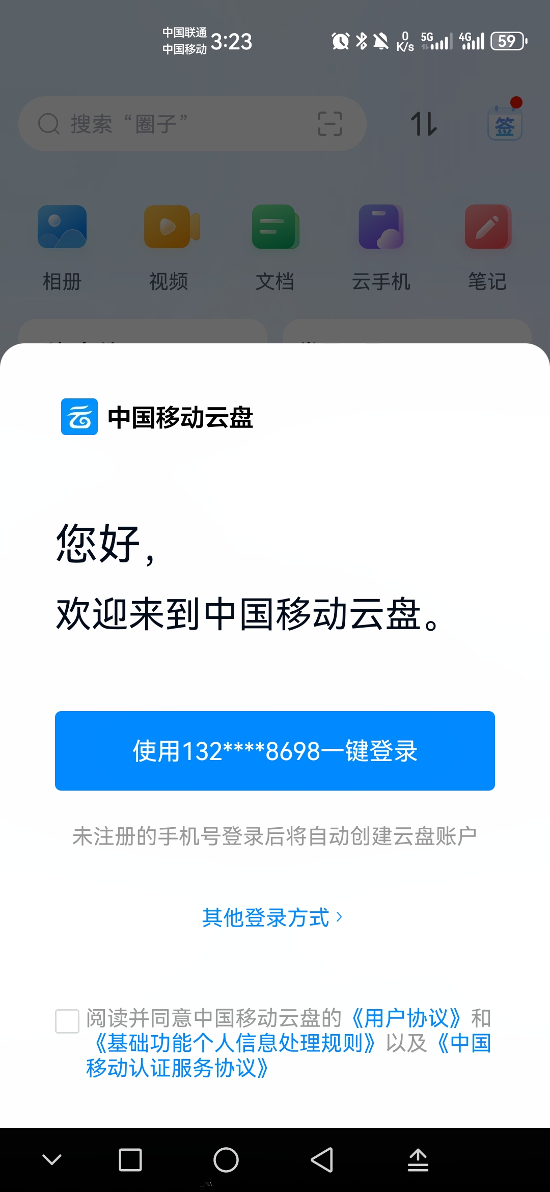 2.点击使用自己的本机号码一键登录,勾选同意和阅读协议。注意的是未注册的手机号登录后将自动创建云盘账户。
