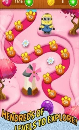 本作以大家耳熟能详的小黄人世界为舞台背景,玩家将扮演一名泡泡射手,目标是清理屏幕上各种复杂排列的彩色泡泡阵。游戏的核心循环清晰明了:每个关卡初始,屏幕上方会形成一个由多种颜色泡泡组成的泡泡墙,玩家从屏幕底部发射泡泡,通过撞击与匹配来消除它们。关卡目标多样,可能要求清除所有特定颜色的泡泡,也可能需要在限定步数内让一定数量的小黄人安全落地。随着关卡推进,泡泡墙的构造会越发复杂,出现如木头、冰块、金属链等障碍物,甚至会有不断下压的泡泡顶棚,这些设计都极大地丰富了游戏的策略维度,要求玩家不仅要有精准的射击技巧,更需具备前瞻性的布局规划能力。