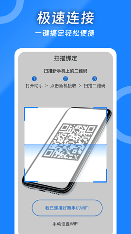 第二步:角色选择与设备连接。在新手机上打开软件,点击这是新手机按钮。在旧手机上打开软件,点击这是旧手机。此时,新手机屏幕上会生成一个二维码。使用旧手机的扫描功能对准此二维码,或等待软件自动搜索发现附近设备,点击确认即可建立安全连接。