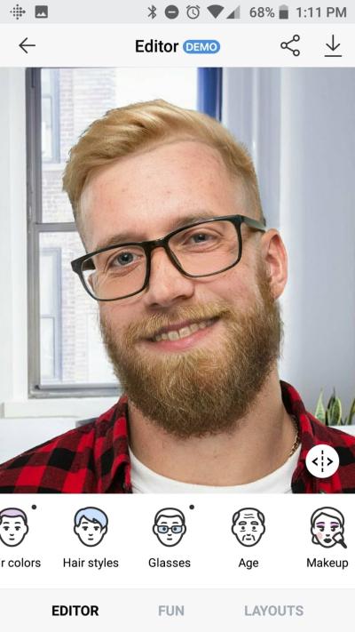 在应用了主要特效后,您可以进行叠加编辑。返回到主功能菜单,尝试添加其他效果。在年龄变化的基础上,点击微笑功能,为人物添加一个自然的笑容;或者进入发型库,选择一个新发型进行虚拟试戴。每一步操作都是独立且可调整的。