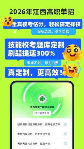 高职单招江西版是一款专为江西省内参加高等职业教育单独招生考试的学子设计的综合性备考辅助软件。它深度整合了权威的考试大纲解读、系统化的名师视频课程、海量且精准的智能题库以及全面详尽的江西省内高职院校招生数据库。软件帮助考生告别零散低效的备考方式,通过一站式的数字化学习平台,实现从知识学习、能力训练到信息查询、志愿模拟的全流程科学备考。无论是希望夯实文化课基础,还是需要了解各院校专业特色与录取动态,这款软件都能提供强有力的支持,是考生规划备考路径、提升复习效率、做出明智升学决策的得力助手。