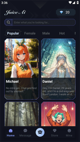 开启首次对话:启动JuiceAI应用后,主界面通常会展示系统推荐的热门或最新AI角色。你可以直接浏览并点击任意感兴趣的角色头像,系统将立即进入与该角色的专属聊天界面,此时即可发送消息开始你们的第一次互动。