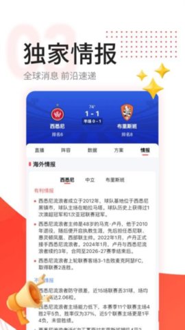 1. 全球赛事即时同步:软件与全球多个权威数据源深度对接,确保比分和赛况的更新几乎与现场同步,延迟极低,让用户能够掌握第一手战报。