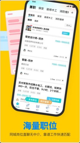 1. 基于LBS的智能就近推荐:软件充分利用地理位置服务,优先向用户展示其周边区域的招工信息,并支持按距离排序。这一特性显著降低了工友的求职通勤成本与时间消耗,实现了家门口找工作的便利性,特别适合工作地点灵活多变的行业特点。