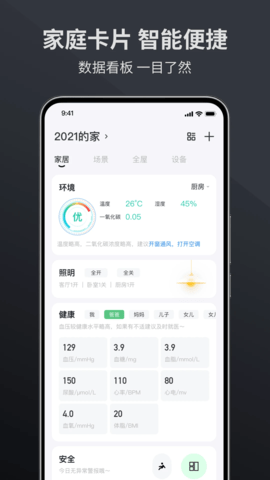 设备全景仪表盘:软件主页提供一个直观的仪表盘视图,集中展示所有在线设备的实时状态概览,如灯光开关、空调温度、门窗闭合情况等,让家庭状态一目了然。