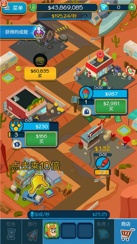 核心点击与建造循环是游戏的基石。玩家通过手指点击屏幕中央的主金币图标来产生基础资金,这是最原始也是最直接的收入来源。获得资金后,即可在建造菜单中解锁第一家店铺,此后该店铺便会开始自动生产金币。玩家需要不断在主动点击获取现金和投资建筑实现自动化生产之间找到平衡,推动收益指数级增长。
