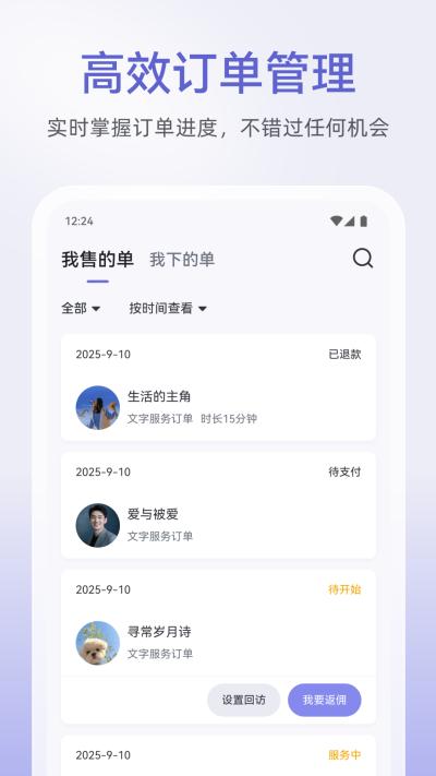 成功入驻后,您将进入核心工作界面。管理订单是日常工作的重点:进入订单中心,您可以一目了然地看到所有订单的状态分类。点击任意一个订单卡片,即可进入详情页,查看来访者的具体诉求、预约时间等信息,并可根据情况点击接单、开始咨询或完成等按钮来推进订单状态。
