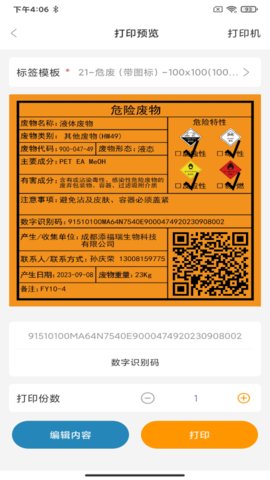第三步:生成标识并执行打印。在废物管理列表中,选中需要制作标识的废物条目,点击生成标识按钮。系统将弹出标识预览界面,请仔细核对所有信息,特别是废物代码、危险特性符号和警示语句。确认无误后,确保蓝牙打印机已开启并连接,点击预览界面的打印按钮,即可输出实体标签。