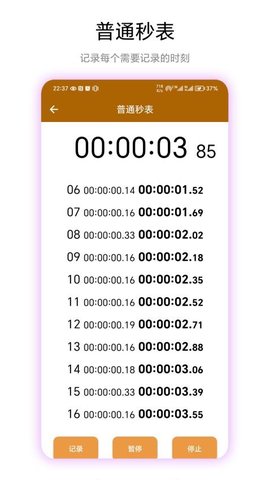 普通秒表模式:提供标准的启动、暂停、停止和计次(分段计时)功能。每次计次的时间点与当段时长都会实时记录并形成列表,方便用户分析各阶段耗时,适用于运动训练、实验计时、演讲练习等场景。