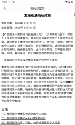 友缘相遇是一款基于智能算法与兴趣图谱的现代化社交应用,帮助用户突破传统社交圈的限制,高效、精准地连接志趣相投的伙伴。它不仅通过分析用户设定的多维标签(如兴趣爱好、生活方式、价值观等)进行个性化推荐,更内嵌了即时通讯、主题聊天室、互动游戏及动态社区等多种互动场景,构建了一个从线上破冰到线下拓展的完整社交生态。软件营造真实、安全的社交环境,采用实名认证与内容审核机制,其流畅的交互设计与人性化的功能设置,让寻找朋友、分享生活和深化关系的过程变得自然且充满乐趣,满足了当代人在快节奏生活中对高质量、有深度社交连接的迫切需求。
