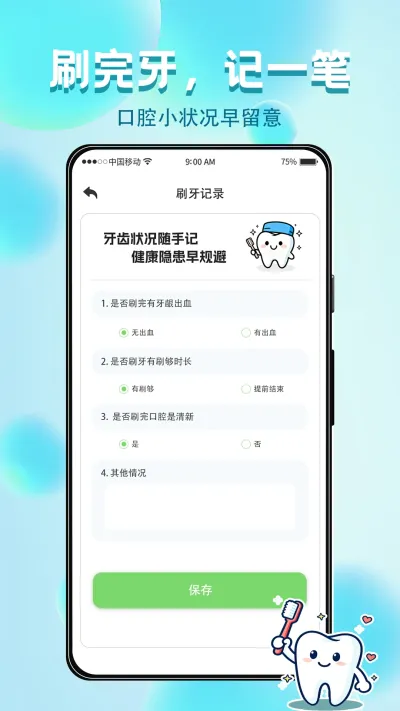 养成即时记录的习惯。每次刷牙引导结束后,页面会自然跳转至当日的记录卡。请务必在此刻花费十几秒钟,勾选本次刷牙的实际时长范围,并如实选择是否有牙龈出血、肿痛等异常感受。这些点滴记录是构建您个人健康趋势图的基础,至关重要。