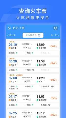 车票服务与行程管理:用户可以在应用内直接完成高铁票的查询、购买、改签与退票操作,支持成人票、学生票等多种票制。所有订单自动生成清晰的行程列表,并附有详细的时刻、座位和检票口信息,方便集中管理。
