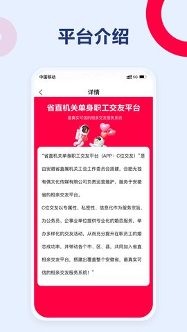 C位交友是一款由安徽省直属机关工会工作委员会牵头指导、合肥无独有偶文化传媒有限公司具体运营的实名制社交软件,它精准定位于服务安徽省内各级党政机关、事业单位及国有企业的在职单身职工群体。软件的核心在于构建一个背景真实、环境纯粹、高效可靠的社交平台,通过对接官方工会组织系统,实施严格的单位审核与实名认证双保险机制,确保每一位注册用户的职业身份和个人信息都经过核验,从源头上杜绝虚假信息。平台不仅提供基于职业特性、兴趣爱好等多维度的智能匹配功能,促进线上初步交流,更着力于策划和组织形式多样的线下实体联谊活动,如主题沙龙、文体竞赛、兴趣工作坊等,帮助日常工作繁忙、社交圈相对固定的机关单位职工,在一个安全、可信且富有共同语言的环境中,打破隔阂,拓展人际网络,寻觅志同道合的朋友乃至人生伴侣。