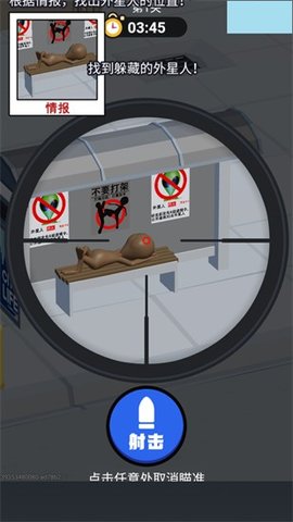 狙击外星人是一款由Rocinante Games开发的休闲射击手游,近期在社交平台热度颇高。游戏的核心体验在于扮演一名星际狙击手,在诸如繁华商业街、静谧公园、人来人往的地铁站等多样化的日常场景中,执行一项特殊任务:从看似普通的环境中,精准识别并狙杀那些拥有高超伪装能力的外星入侵者。这些外星生物并非以狰狞面目示人,而是完美地模仿了人类、广告牌、垃圾桶乃至街边绿植,其伪装之精妙,要求玩家必须全神贯注,通过观察极其细微的异常之处来识破伪装。游戏初期,玩家需要成功找出并消灭3个目标,随着关卡推进,挑战将升级为在限定时间内狙杀更多目标,或要求全程无失误。外星人的隐藏位置、伪装形态和数量均为随机生成,确保了每次游玩的体验都独一无二。游戏界面设计简洁,无弹窗广告干扰,为玩家提供纯粹的观察-识别-狙击沉浸式循环。最新版本更引入了创新的PVP双人对抗模式,玩家在回合制规则下利用挡板进行战术博弈,增添了竞技乐趣。从模拟真实光学效果的瞄准镜开镜瞬间,到击中外星人时触发的炫酷特效与音效,再到可辅助识别的道具系统和个性化的武器外观收集,游戏构建了一套完整且富有吸引力的玩法闭环。