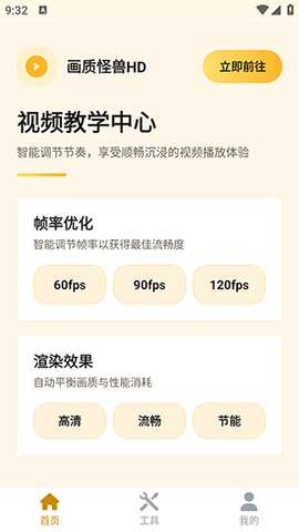 首次启动与核心模块访问:成功安装并打开画质怪兽HD后,您将看到以卡通风格呈现的主界面。界面上清晰列出了GFX动感优化、分辨率/帧率设置、画质增强、音效提升等核心功能模块。请根据您的首要优化目标,想要提升游戏流畅度,则点击分辨率/帧率设置模块下方的【启动】或【运行】按钮。
