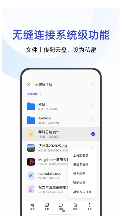 3. 功能设计兼具全面性与专业性,在满足复制、移动等基础需求的提供了压缩解压、直接预览、隐私加密等进阶工具,使其从一个简单的文件浏览器演变为一个综合性的移动数据管理中心。