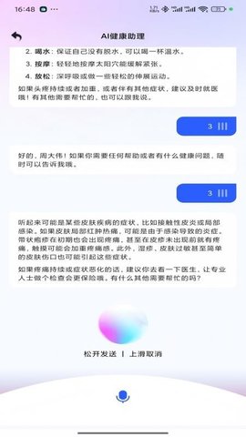 智能语音健康咨询:用户可以直接通过语音输入描述症状或提出健康问题,软件的高精度语音识别系统能准确转译并理解语义,随后调用AI引擎生成口语化的详细解答,极大提升了交互的便利性,尤其适合在移动中或不便打字的场景下使用。