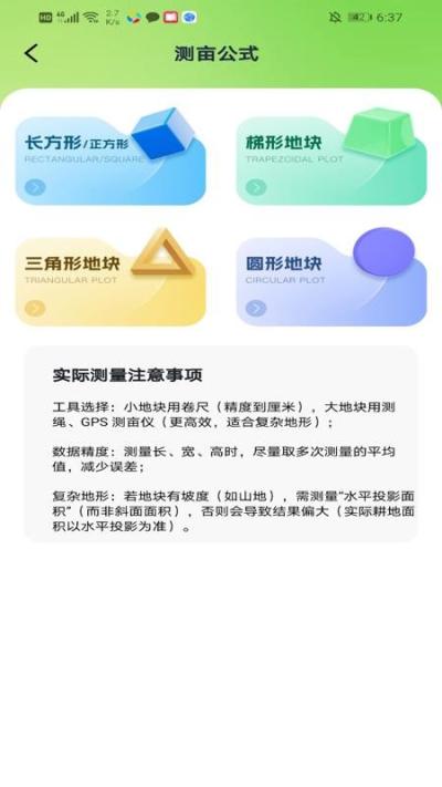 自定义测亩公式参考:针对一些特殊形状或需要特定计算方法的土地,提供了多种面积计算公式的说明和参考。用户可以根据实地形状(如三角形、梯形、圆形等)选择对应的公式,并结合手动输入的参数进行估算,增加了软件在应对复杂情况时的灵活性。