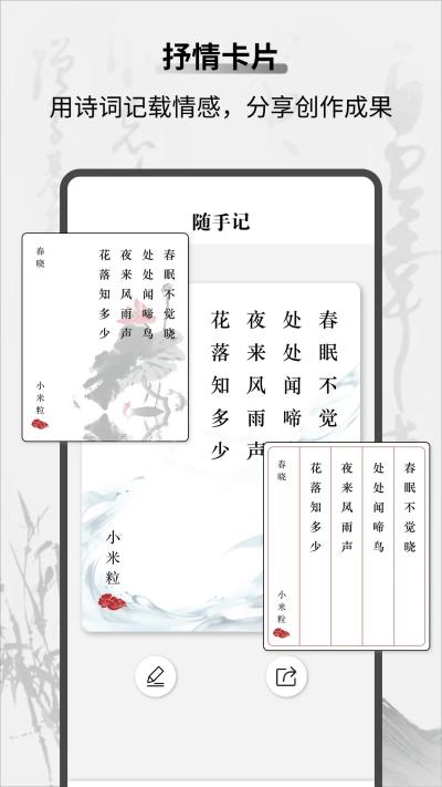 创作辅助与灵感激发:设有练笔区功能,提供诗词格律检测、押韵查询、典故词典等工具,辅助用户进行古典诗词创作,会随机展示经典诗词中的佳句,或提供一幅古画作为题目,激发用户的创作灵感。