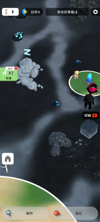 核心资源循环:游戏初期,玩家通过点击或划屏探索安全区周边,收集木材、石料等基础材料。界面上的实时进度条清晰显示收集量。这些资源用于建造和升级基础设施,如扩充背包容量、提升仓库库存。使用加速功能可以瞬间完成单次收集或建筑升级,是管理效率的关键。