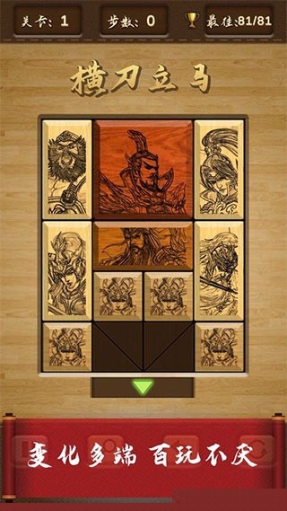 游戏的基本操作是全盘的滑动移动。玩家需要仔细观察棋盘上所有棋子的布局,识别出曹操方块(最大的正方形)与底部出口之间的障碍。通过长按并拖动任意一个棋子,在其移动方向有空格的情况下,使其滑入空位,从而逐步调整全局布局。