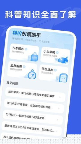 出行百科与实时政策更新:内置的百科模块涵盖了从值机、安检、登机到行李托运、出入境注意事项等全流程乘机指南,会紧跟各航空公司及机场的最新政策(如行李额变更、特殊证件要求)进行动态更新,是出行新手的得力助手。