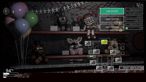 全局电力管理。屏幕顶部的电力计是玩家最需要关注的全局资源。几乎每一项主动防御行为(除戴面具)都会消耗电力。电力耗尽意味着所有电子设备瘫痪,玩家将在黑暗中毫无防护地面对所有玩偶。整个游戏过程本质上是一个长期的资源规划问题,玩家需要为可能到来的危机高峰(如多个高AI玩偶活跃的后半夜)预留足够的电力储备。