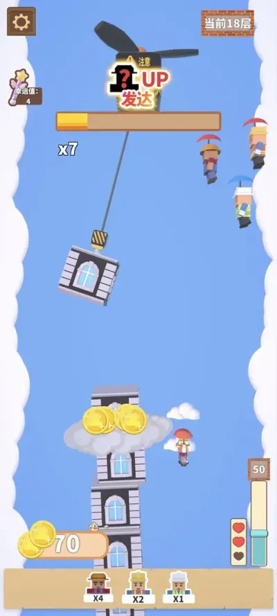 多样化的特殊楼块与道具系统极大地丰富了玩法维度。游戏中除了标准楼块,还会出现如加固合金块、弹性缓冲块、低摩擦力玻璃块等具有特殊属性的材料。如何根据当前建筑的结构状态和面临的挑战(如强风),策略性地选择和使用这些特殊楼块,是通往更高层的关键,考验玩家的即时决策与资源管理能力。