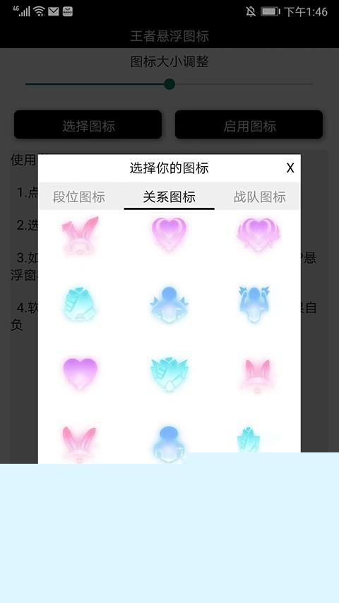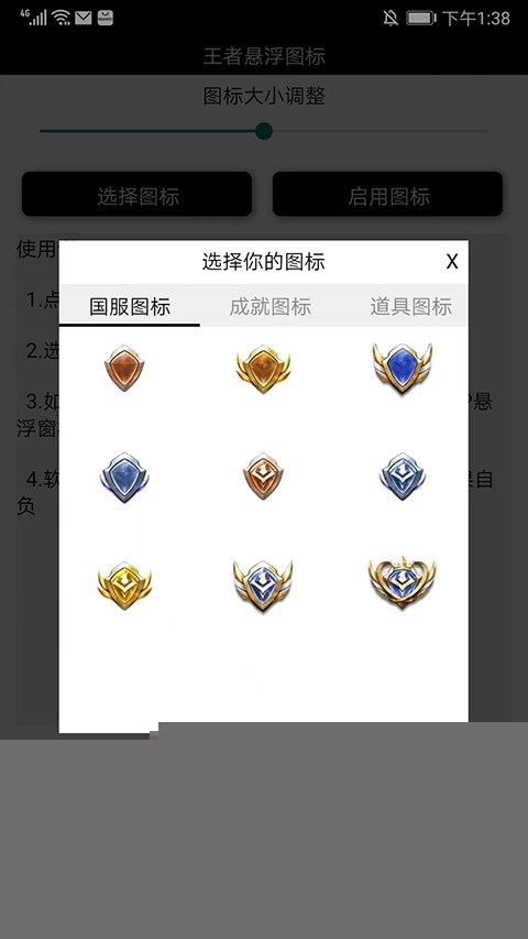 首次启动应用后,请稍等片刻完成初始化加载。进入主界面,您会看到清晰的功能分区。首先点击核心的【选择图标】按钮,进入图标资源库。您可以按分类(如国服、成就、段位)浏览,或使用搜索功能查找特定图标,点击即可选中并进入详情页。