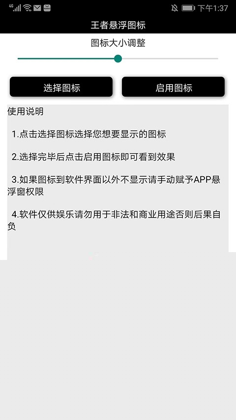 授权完成后返回应用主界面。您可以通过拖动大小调节滑块来精确控制图标的显示尺寸,利用透明度滑块调整其虚实程度。设置满意后,点击【启动图标】按钮,所选图标便会立即以悬浮窗形式出现在屏幕边缘。