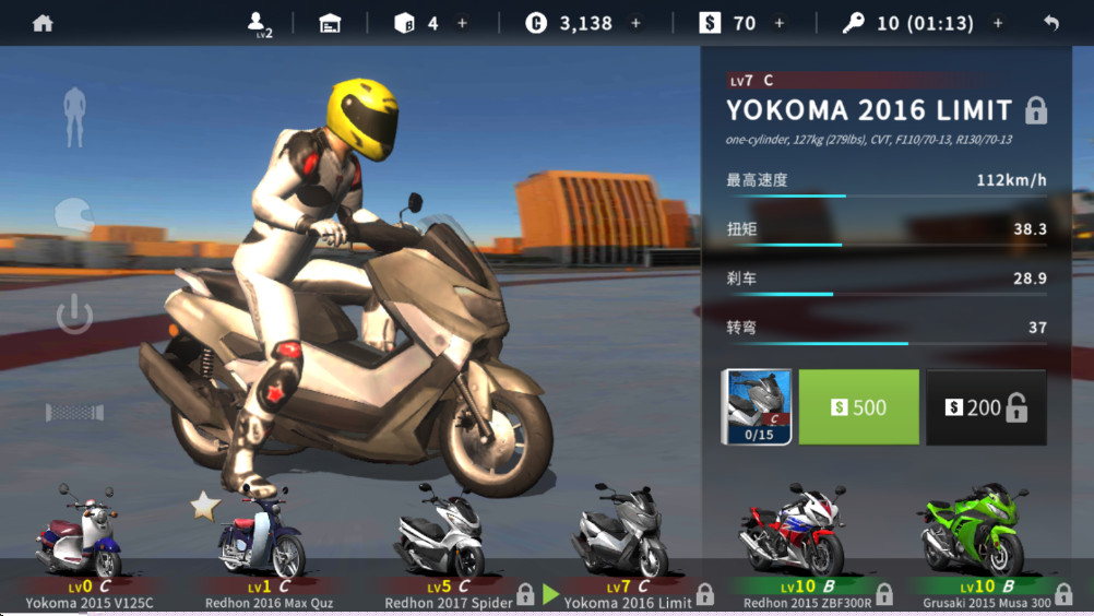 车辆与装备管理:玩家需要管理自己的车库,包括购买新车、出售旧车,以及对现有车辆进行维护与升级。装备库系统允许玩家为角色搭配不同风格的骑行服、手套、靴子和头盔,这些装备有时也会附带轻微的属性加成,兼顾美观与实用性。