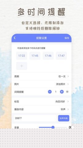 添加一个新闹钟:点击添加闹钟按钮,进入设置页面。你可以通过滑动或点击数字来设定具体的小时和分钟。选择闹钟的重复周期,如仅一次、工作日、每天或进入自定义选择特定日期。在铃声选项中,你可以浏览并试听系统内置的多种舒缓铃声,也可以点击从本地选择使用手机内的音乐文件,或者使用录制新铃声功能现场录制一段个性化的提醒声音。别忘了设置贪睡模式的间隔时间(如5分钟)和次数限制。为这个闹钟起一个易于识别的标签,如晨跑,点击保存。
