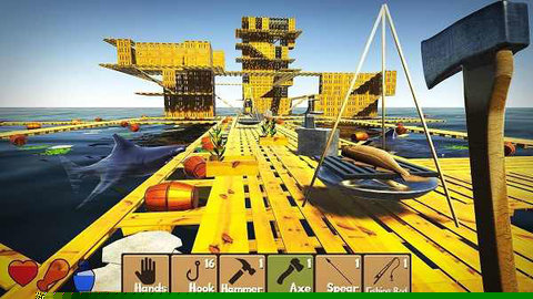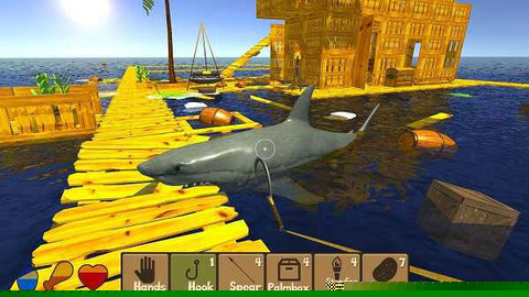 动态且充满威胁的海洋生态:游戏中的海洋并非静态背景。鲨鱼作为主要的自然威胁,其行为难以预测们会持续撞击木筏边缘,试图将其拆散,也会主动攻击任何胆敢下水的玩家。这种持续的威胁迫使玩家必须将防御工事的建设作为优先事项,也让每一次水下采集物资的行动都变成一次心跳加速的冒险。