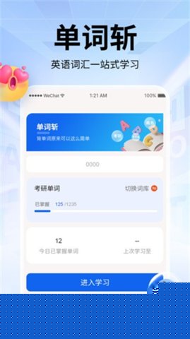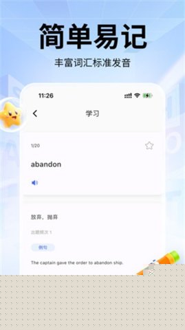 单词斩是一款结合记忆科学与趣味学习的英语词汇记忆工具,通过图文联想、智能复习与个性化词库,帮助学习者高效掌握单词,适用于各类英语考试及日常学习,采用图文结合方式,每个单词配有生动插图和实用例句,建立形象联系,增强记忆效果。智能复习系统依据艾宾浩斯遗忘曲线,自动推送需巩固的词汇,确保长期记忆。个性化词库覆盖中考、高考、四六级、考研、托福雅思等主流考试词汇,用户可自由选择学习目标。每个单词搭配趣味插图和情境例句,建立视觉与语义联系,显著提高记忆持久性。基于艾宾浩斯遗忘曲线,自动分析学习进度,精准推送复习内容,巩固长期记忆效果。涵盖多种考试词汇,如中考、高考、四六级等,用户可根据需求自由选择,实现针对性学习。高效记忆方法:科学记忆法则结合多重感官刺激,使单词学习更深刻,提升整体词汇掌握水平。全面学习资源:覆盖从基础到高级的词汇需求,一站式满足不同学习阶段,无需额外工具。流畅操作体验:界面设计简洁直观,操作步骤清晰,帮助用户保持专注,提高学习效率。