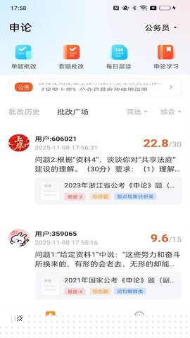 历年真题智能组卷与模考:收录完整的历年公考真题,用户可根据自身需求(如特定题型、年份、难度)自由组卷进行模拟考试,考后即可获得全面的成绩分析与排名预估。