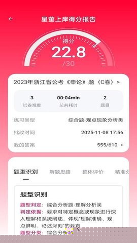 上传成功后,系统会进入自动识别与分析阶段,通常数秒内即可完成。批改报告页面会分板块展示:本题得分、各评分项细则(如要点是否齐全、逻辑是否清晰、表述是否规范)、详细的改进建议以及一道同类型题目的推荐练习。