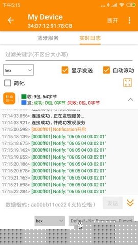 实时数据通信:允许用户对选定的特征值进行读取、写入操作,并可订阅其通知或指示,实现与BLE设备的双向数据交互,所有收发数据均实时显示在主界面。