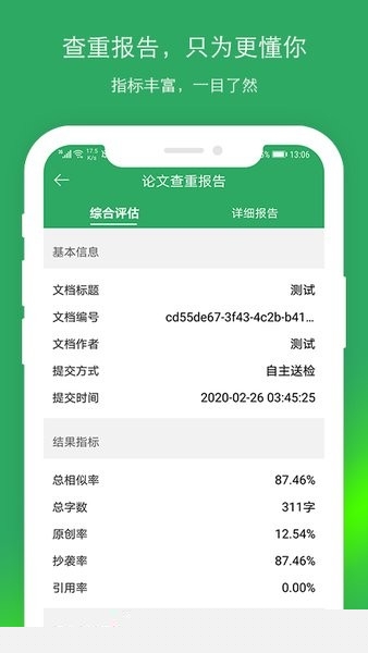 2. 高效的检测与报告生成速度:得益于先进的智能解析与分布式计算技术,系统通常能在上传文档后的十分钟左右完成全篇检测,并同步生成包含全文标红、相似来源列表、综合相似度等信息的可视化详细报告,极大地节省了用户的等待时间。