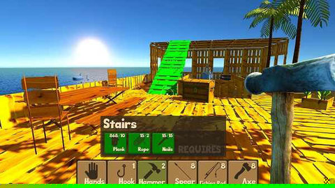 木筏扩建与基地建造:使用收集到的材料,通过建造锤菜单,可以铺设新的木筏地板,扩展生存面积。在此基础上,竖起墙壁、安装门窗、搭建屋顶,形成封闭的室内空间以躲避恶劣天气。建造储物箱、工具台、烧烤架等设施,将木筏从运输工具转变为功能齐全的移动基地。
