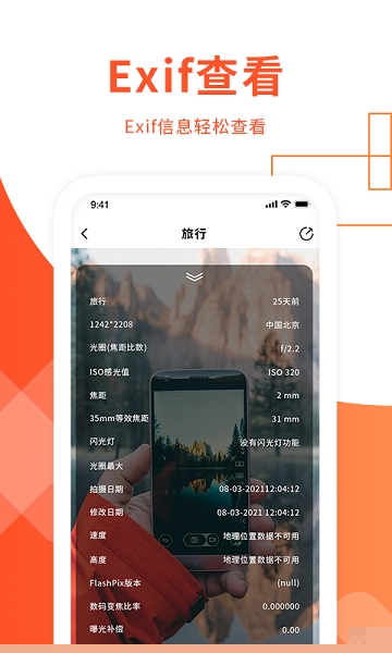 详细的拍摄参数全景展示:它提供了一个高度组织化的信息面板,将繁杂的EXIF数据分门别类地展示,如相机信息(品牌、型号)、镜头详情(焦距、光圈)、拍摄设置(快门速度、ISO、曝光补偿)、闪光灯模式以及图像属性(分辨率、色彩空间)等,让用户对拍摄条件一目了然。