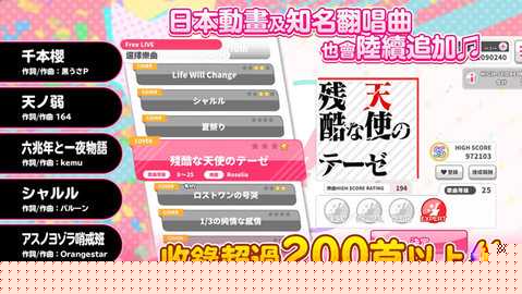 游戏收录了海量曲目,覆盖J-POP、动漫歌曲、原创曲乃至V家曲目等多种风格,且曲库通过版本更新持续扩充。绝大部分歌曲均提供了从简单到专家多个难度级别的谱面,无论是刚入门的新手还是追求极限的资深玩家,都能找到适合自己的挑战。谱面设计并非单纯堆砌音符密度,而是注重与歌曲旋律、节奏乃至情感表达的契合,演奏过程如同亲自参与乐队编排,沉浸感十足。