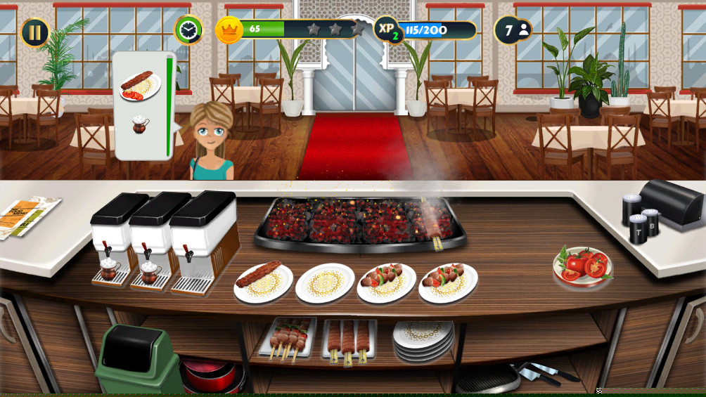 动态顾客满意度系统:每位顾客的头顶都有清晰可见的耐心条与需求标识,他们对等待时间、菜品质量(是否烤焦)甚至饮品搭配都有即时反馈,要求玩家必须在速度与品质间找到最佳平衡点。