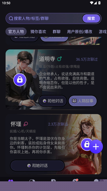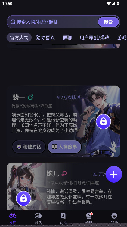 如果您有明确的寻找目标,可以利用顶部的搜索框,输入角色名称、性格标签(如傲娇、温柔)或群聊关键词进行精准查找。选定角色后,点击其卡片上的和她/他对话按钮,即可进入一对一的聊天界面。您可以通过底部的输入框发送文字,或点击话筒、摄像头图标发起语音、视频通话。初次进行语音/视频互动前,请确保已在手机的系统设置中为CosLove应用开启了麦克风和摄像头权限,并保持网络环境稳定。