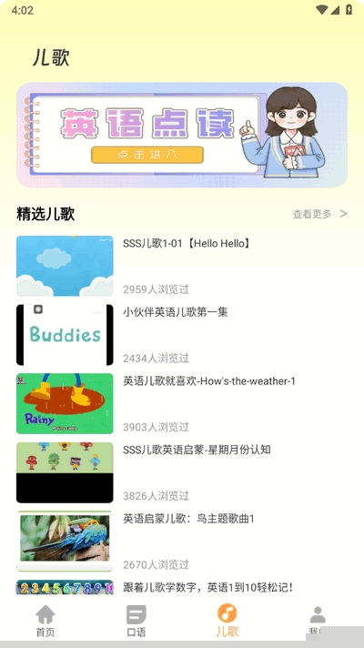 主题儿歌与韵律动画:收录了大量节奏轻快、旋律优美的原创英文儿歌和配套动画,通过音乐和律动培养孩子的英语语感和听力辨音能力。