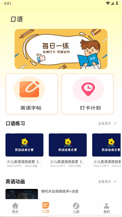 情景口语跟读练习:围绕日常生活中的各种情景,如问候、就餐、游玩等,提供短句和对话跟读练习。结合智能评测,有效提升孩子的口语流利度和发音准确性。