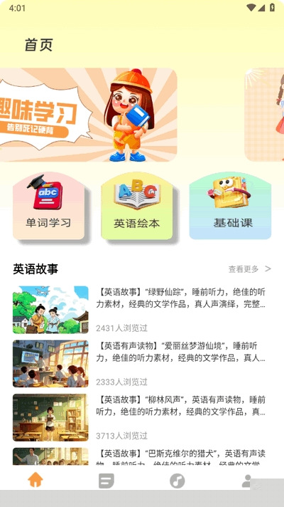 在互动绘本模块中,选择孩子感兴趣的主题故事进入。阅读时,鼓励孩子自主点击画面中的动物、食物、交通工具等元素,聆听对应的英文单词和趣味音效,并跟随系统提示跟读页面中标注的重点词汇。